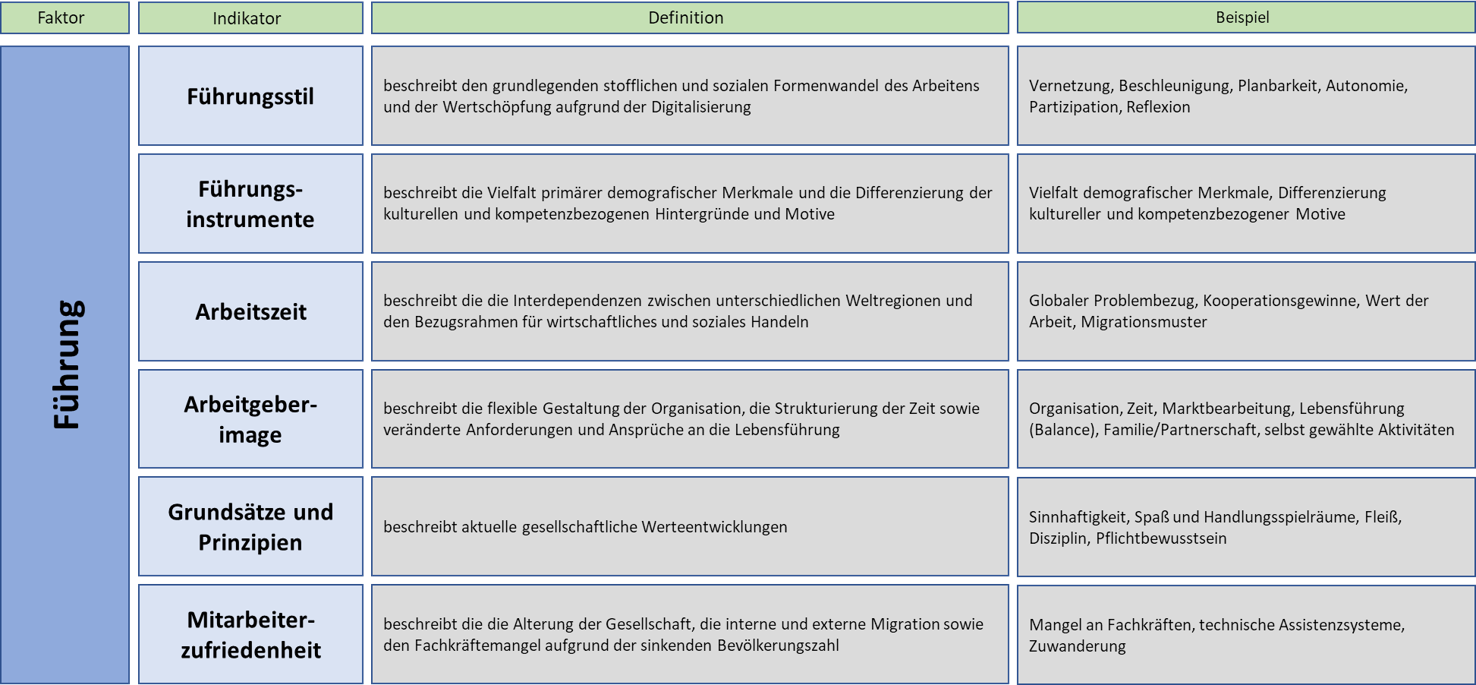 Die Technologie Indikatoren repräsentieren den Faktor der Technologie. Die grundsätzliche technologische Ausrichtung in einem Unternehmen wird durch die Strategie bestimmt. Der Automatisierung und die technischen Assistenzsystem bestimmen den Grad der Unterstützung bzw. Vereinfachung der manuellen Tätigkeiten. Die Informationsverarbeitung und Bearbeitung beschreiben die Nutzung der vorhandenen Daten und das Ausmaß der automatisierten Entscheidungskompetenzen