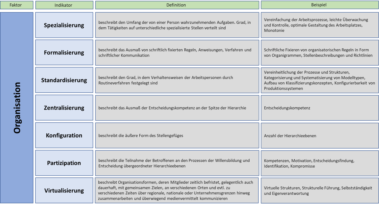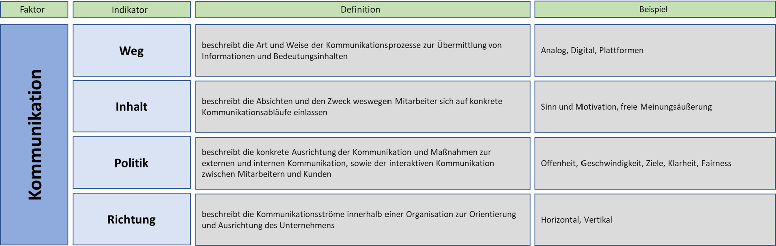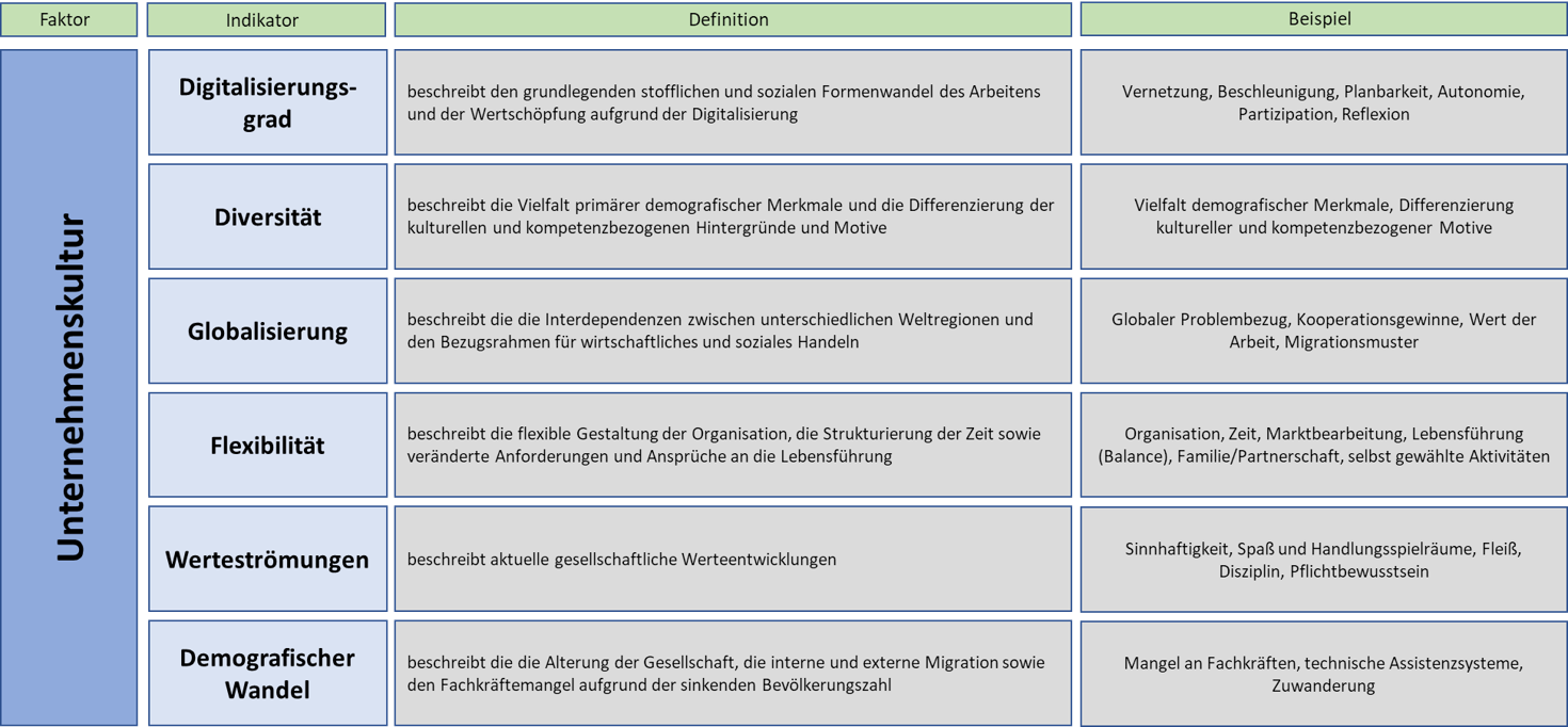 Die Kulturindikatoren repräsentieren den Faktor der Unternehmenskultur. Die Unternehmenskultur werden allgemein die kognitiv entwickelten Fähigkeiten einer Unternehmung sowie die affektiv geprägten Einstellungen ihrer Mitarbeiter zu Aufgaben, Produkten, Kollegen , zur Führung und zur Unternehmung in ihrer Formung von Perzeptionen und Präferenzen gegenüber Ereignissen und Entwicklungen verstanden.